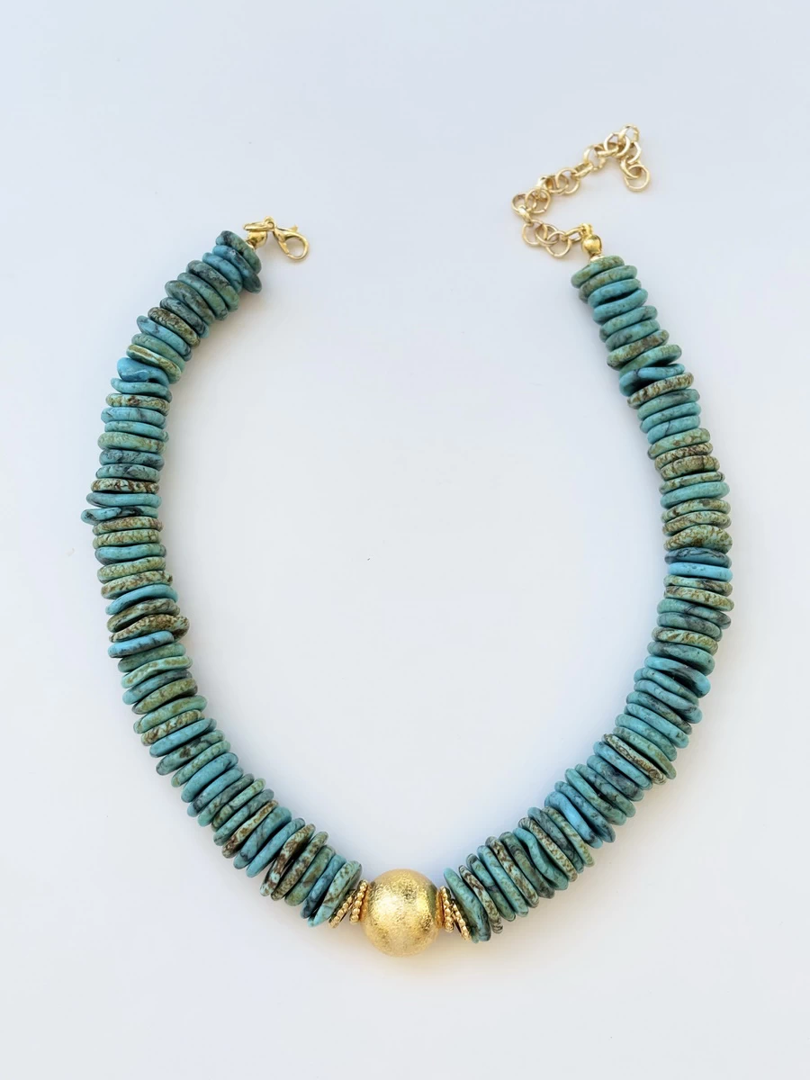 Sakinleştirici howlit doğal taşının dingin enerjisi, altın kaplama ara malzemelerle buluşarak zarafetin ve huzurun mükemmel birleşimini sunuyor.
