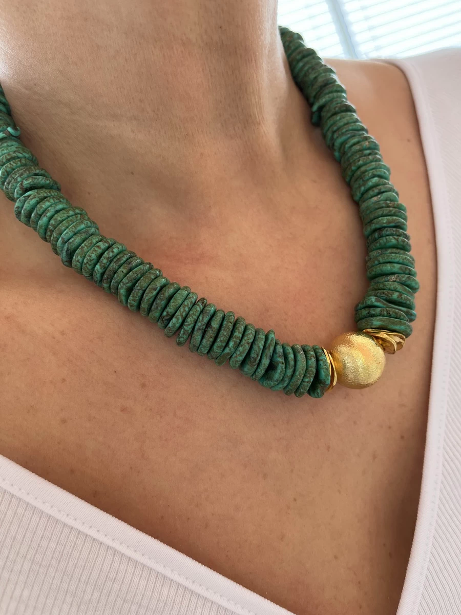 Sakinleştirici howlit ve doğanın ferahlatıcı enerjisini taşıyan yeşil doğal taşların uyumu, altın kaplama ara malzemelerle buluşarak zarafetin ve huzurun mükemmel birleşimini sunuyor.