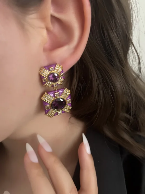 Mor rengin asil duruşu ve altının ışıltısı, bu küpeleri ister günlük kullanımda sofistike bir detay, ister özel davetlerde göz kamaştırıcı bir aksesuar olarak kullanmanız için ideal kılar.
